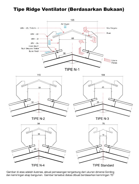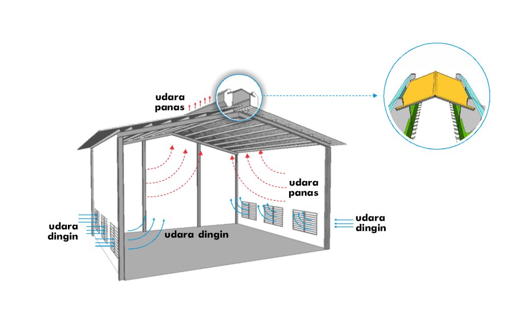 Udara panas yang terperangkap dalam bangunanakan keluar melalui ventilator atap dan digantikan oleh udara segar dari bawah melalui kisi-kisi/louver. Cocok untuk gudang, pabrik, dan bangunan multifungsi.