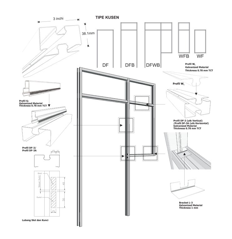Kusen baja galvanis untuk pintu dan jendela diproduksi dari material terbaik melalui proses modern dan presisi. Kuzenku menggunakan standar Galvanized ASTM A527 yang setara dengan JIS G2428 serta dilapisi dengan sistem powder coating warna coklat dan putih.